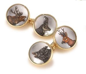 Diese Manschettenknöpfe mit Hirsch, Reh, Keiler und Gams Abbildungen in Gold gefasst stammen aus der HALDER-Schmuckkollektion Halder Crystals.
